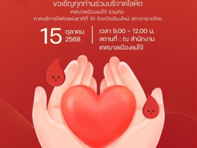 เทศบาลเมืองแม่โจ้ ขอประชาสัมพันธ์ เชิญชวนผู้สนใจร่วมบริจาคโลหิต ณ สำนักงานเทศบาลเมืองแม่โจ้ ในวันพุธที่ 15 ตุลาคม พ.ศ. 2568 ตั้งแต่เวลา 13.30 - 16.00 น.