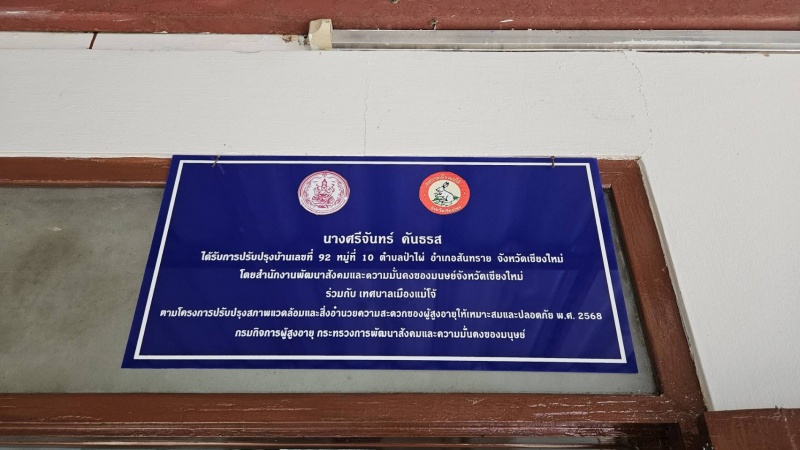 โดยเทศบาลเมืองแม่โจ้ได้รับงบประมาณสนับสนุน จำนวน 40,000 บาท (สี่หมื่นบาทถ้วน) จากสำนักงานพัฒนาสังคมและความมั่นคงของมนุษย์จังหวัดเชียงใหม่ เพื่อปรับปรุงซ่อมแซมบ้านของ นางสาวศรีจันทร์ คันธรส อายุ 72 ปี เลขที่ 92 หมู่ที่ 10 ซอย 11 ซึ่งประสบปัญหาหลังคาบ้านผุพัง มีช่องโหว่ขนาดใหญ่ ต้องใช้ผ้าใบกั้นแดดกันฝนมาเป็นเวลานาน ไม่เหมาะสมและไม่ปลอดภัยต่อการอยู่อาศัยของผู้สูงอายุ