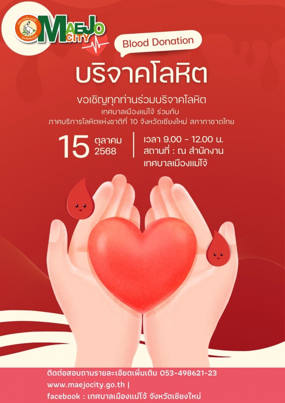 เทศบาลเมืองแม่โจ้ ขอประชาสัมพันธ์ เชิญชวนผู้สนใจร่วมบริจาคโลหิต ณ สำนักงานเทศบาลเมืองแม่โจ้ ในวันพุธที่ 15 ตุลาคม พ.ศ. 2568 ตั้งแต่เวลา 13.30 - 16.00 น.
