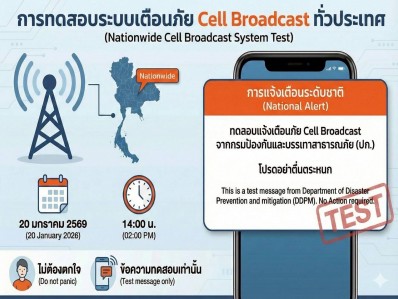 เทศบาลเมืองแม่โจ้ ขอประชาสัมพันธ์ ในวันที่ 20 ม.ค. 69 เวลา 14.00 น. กรมป้องกันและบรรเทาสาธารณภัย (ปภ.) จะมีการทดสอบระบบแจ้งเตือนภัยแบบเจาะจงพื้นที่ (Cell Broadcast Service) ผ่านโทรศัพท์มือถือ เต็มรูป