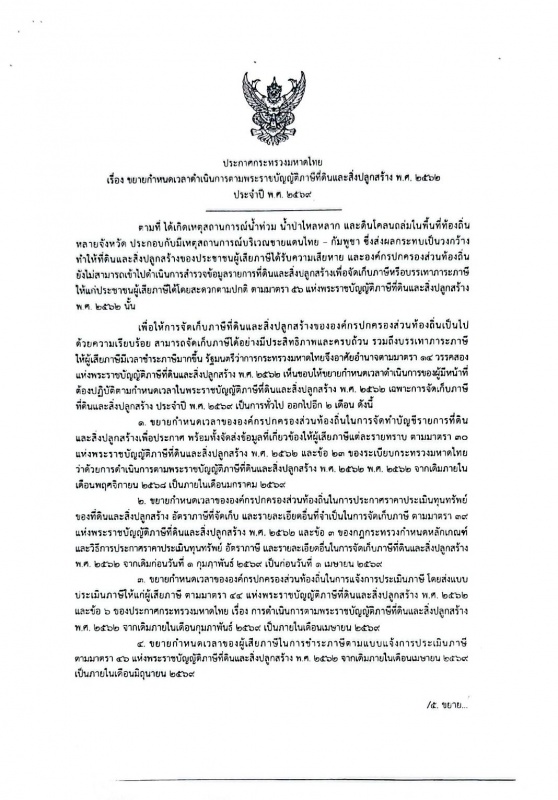 ประกาศกระทรวงมหาดไทย เรื่องขยายกำหนดเวลาดำเนินการตามพระราชบัญญัติภาษีที่ดินและสิ่งปลูกสร้าง พ.ศ.2562 ประจำปี 2569