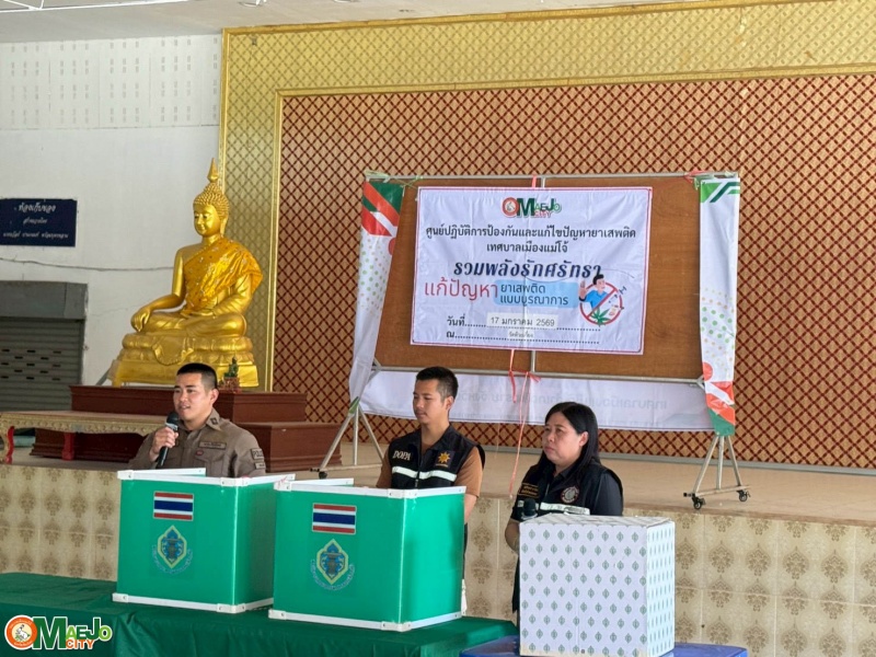 เทศบาลเมืองแม่โจ้ ดำเนินโครงการ บูรณาการสื่อสารชุมชน ทบทวนแผนชุมชน รวมพลังศรัทธาแก้ไขปัญหายาเสพติดแบบบูรณาการ พร้อมทั้งส่งเสริมการจัดตั้ง "กองทุนแม่ของแผ่นดิน" ระหว่างวันที่ 7, 13, 20 ธันวาคม 2568 และ 17, 24, 31 มกราคม 2569