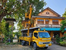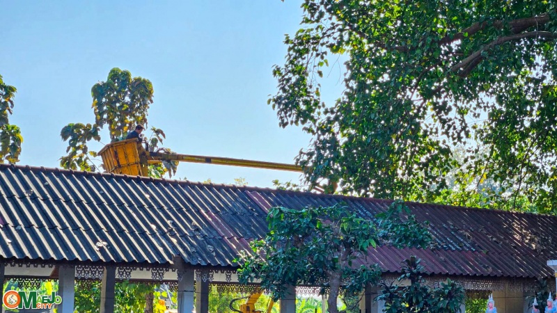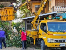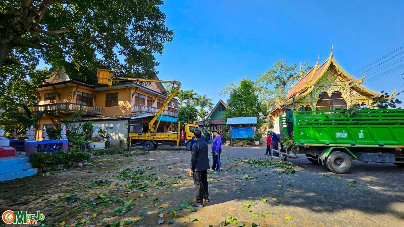 เทศบาลเมืองแม่โจ้ ประสาน อบจ.เชียงใหม่ สนับสนุนรถกระเช้าตัดกิ่งไม้สูง วัดป่าบง