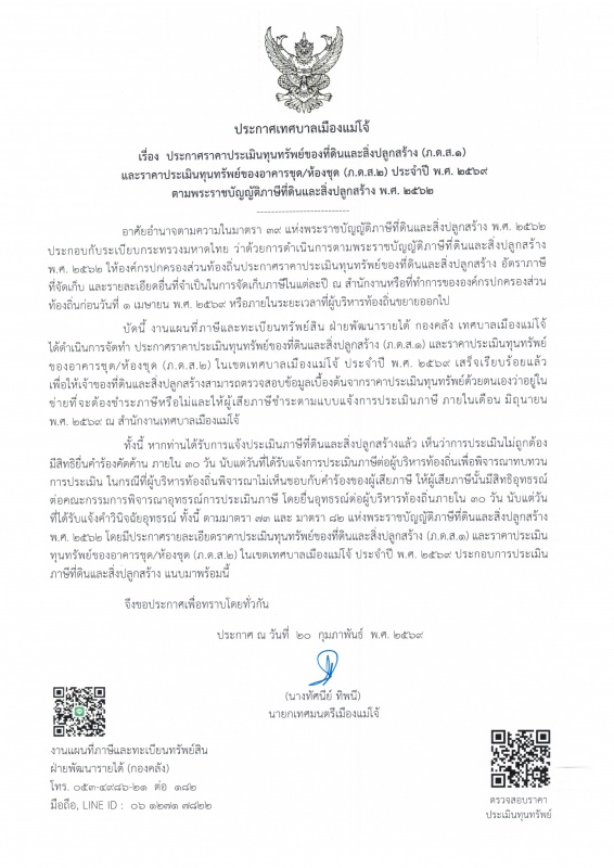 ประกาศเทศบาลเมืองแม่โจ้ เรื่องประกาศราคาประเมินทุนทรัพย์ของที่ดินและสิ่งปลูกสร้าง (ภ.ด.ส.1) และราคาประเมินทุนทรัพย์ของอาคารชุด/ห้องชุด (ภ.ด.ส.2) ประจำปี พ.ศ.2569