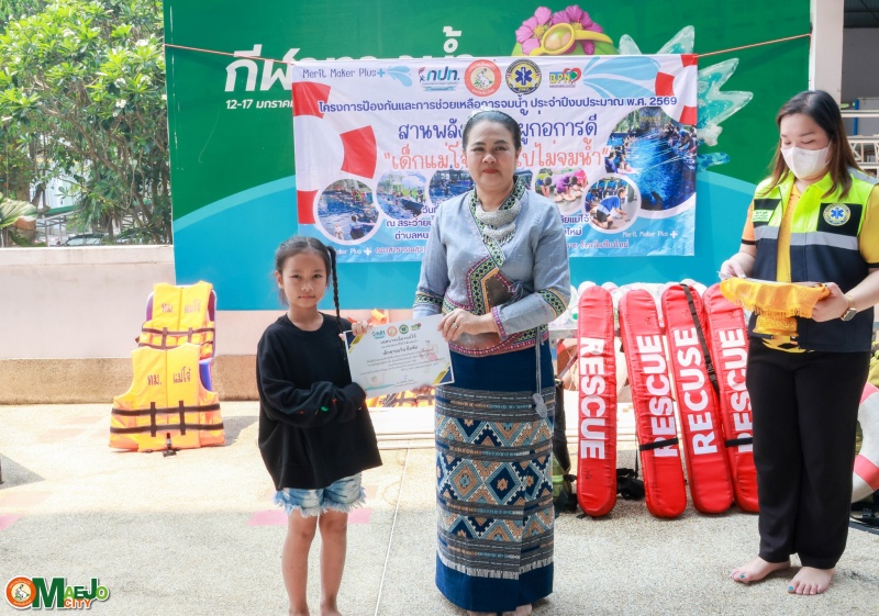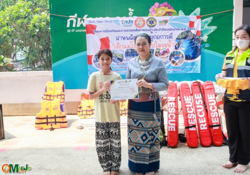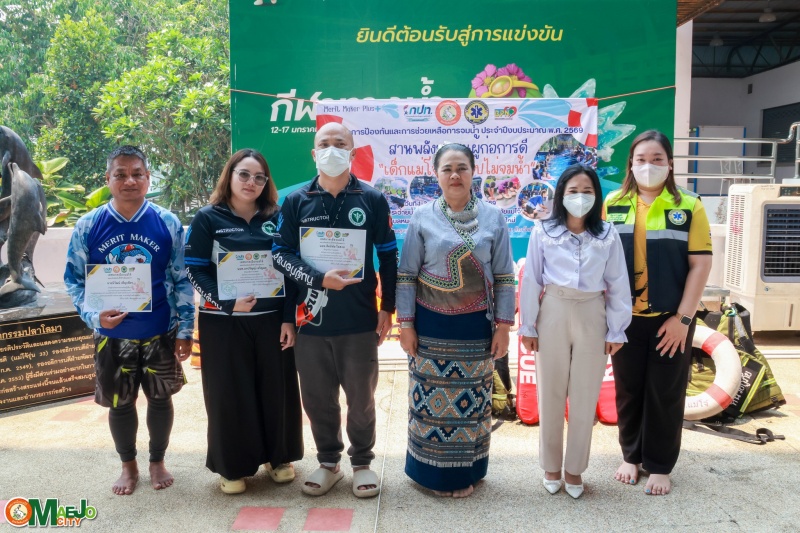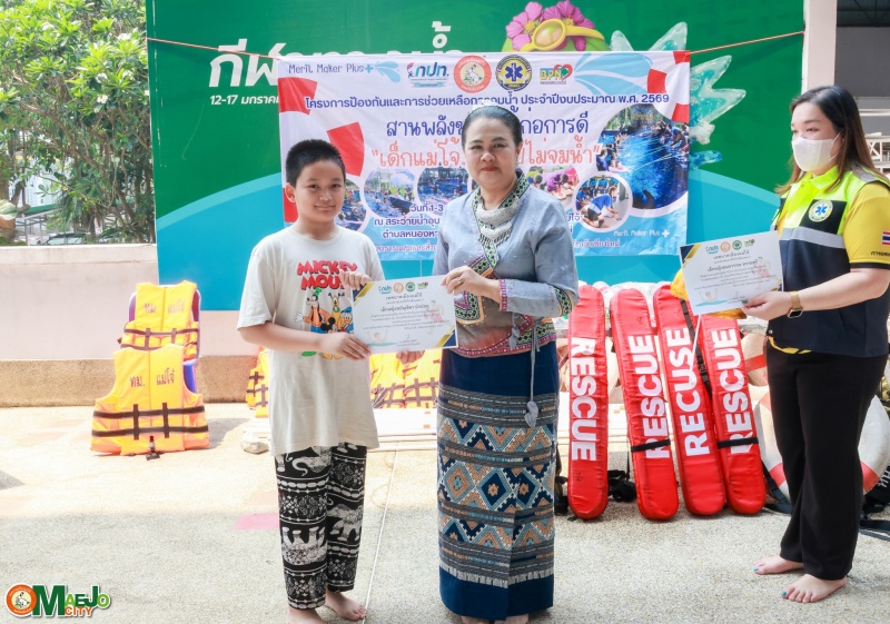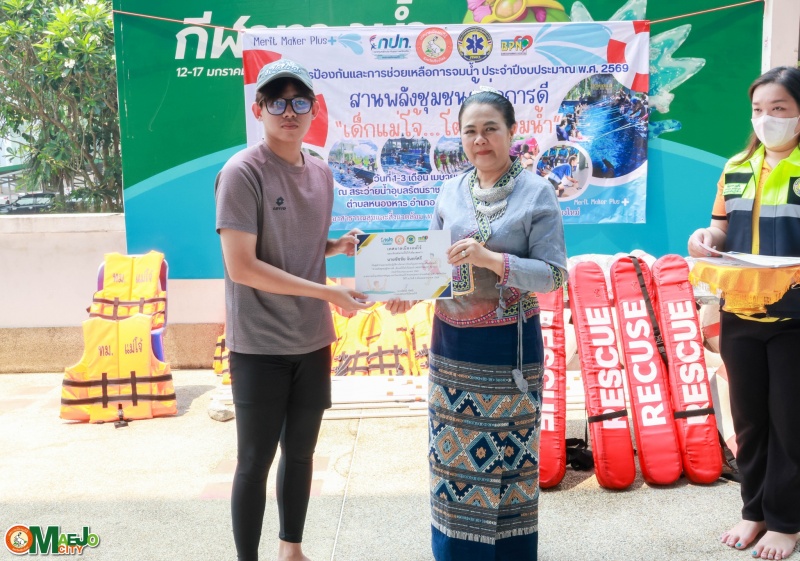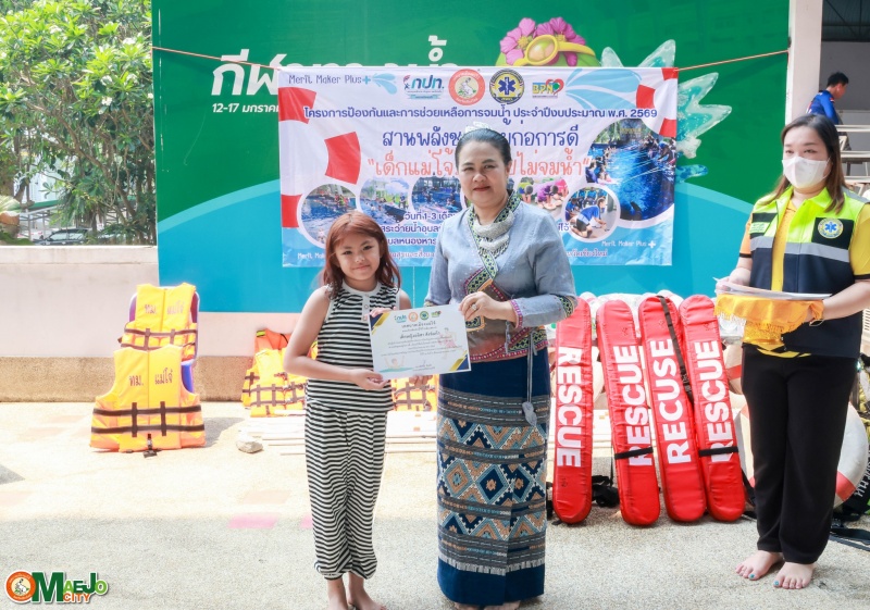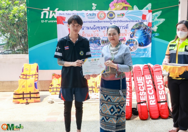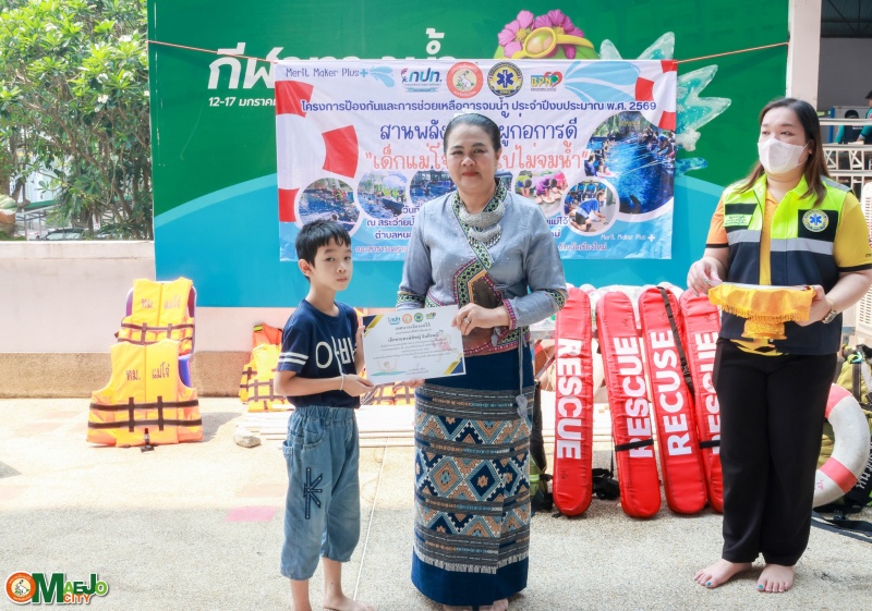 วันที่ 3 เมษายน 2569 นางทัศนีย์ ทิพนี นายกเทศมนตรีเมืองแม่โจ้ เป็นประธานใน พิธีปิดโครงการป้องกันและการช่วยเหลือการจมน้ำ "สานพลังชุมชนผู้ก่อการดี...เด็กแม่โจ้โตไปไม่จมน้ำ" ประจำปี 2569 พร้อมทั้ง มอบใบประกาศนียบัตรให้แก่ผู้เข้าร่วมอบรมที่ผ่านการฝึกอบรมตามหลักสูตร เพื่อเป็นกำลังใจและเชิดชูผู้ที่ได้รับความรู้และทักษะด้านความปลอดภัยทางน้ำ