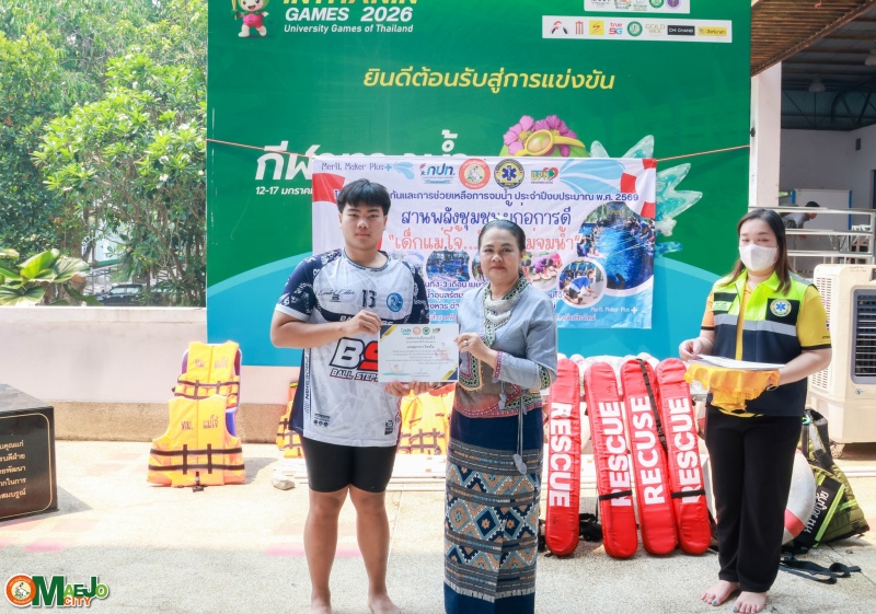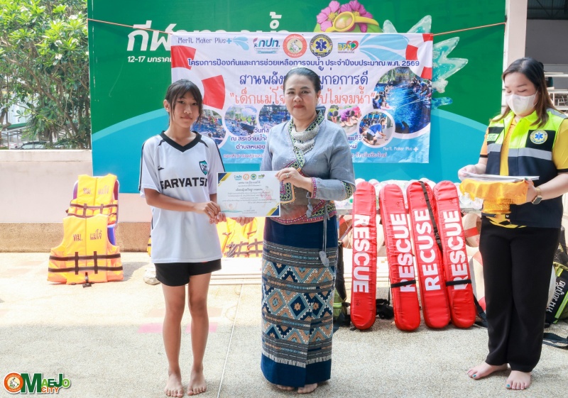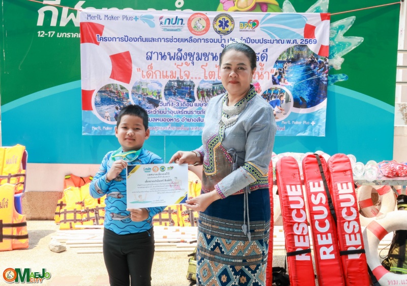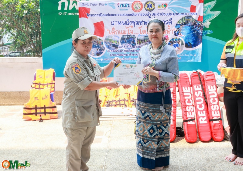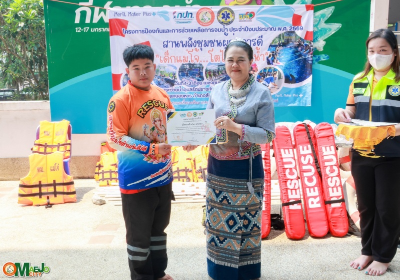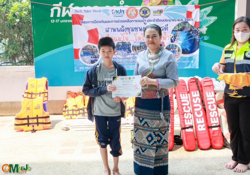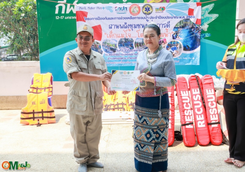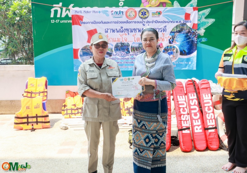วันที่ 3 เมษายน 2569 นางทัศนีย์ ทิพนี นายกเทศมนตรีเมืองแม่โจ้ เป็นประธานใน พิธีปิดโครงการป้องกันและการช่วยเหลือการจมน้ำ "สานพลังชุมชนผู้ก่อการดี...เด็กแม่โจ้โตไปไม่จมน้ำ" ประจำปี 2569 พร้อมทั้ง มอบใบประกาศนียบัตรให้แก่ผู้เข้าร่วมอบรมที่ผ่านการฝึกอบรมตามหลักสูตร เพื่อเป็นกำลังใจและเชิดชูผู้ที่ได้รับความรู้และทักษะด้านความปลอดภัยทางน้ำ