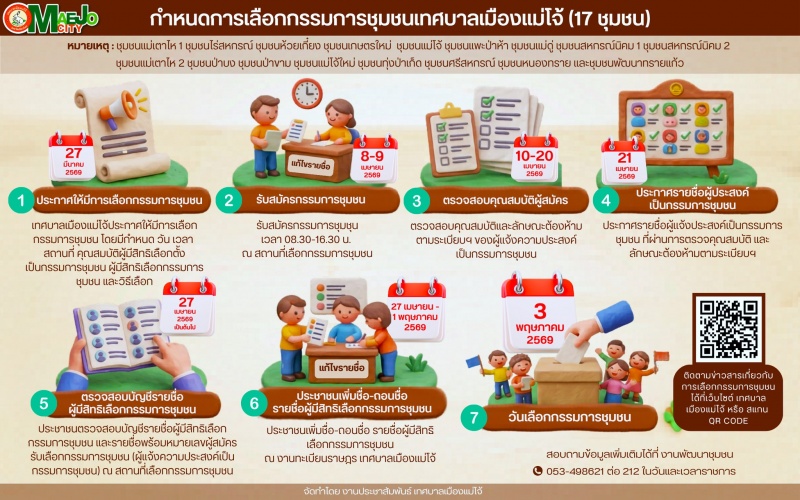 เทศบาลเมืองแม่โจ้ ขอประชาสัมพันธ์กำหนดการเลือกกรรมการชุมชน เทศบาลเมืองแม่โจ้ (17 ชุมชน)