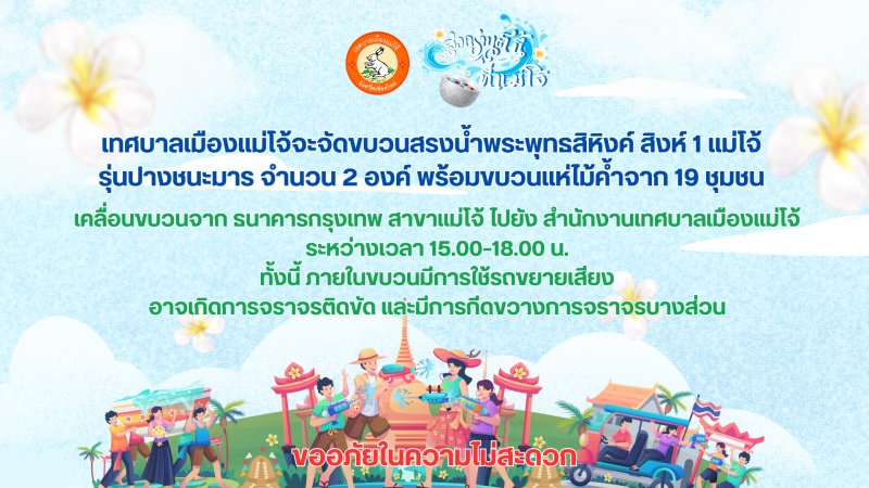 เทศบาลเมืองแม่โจ้ จะจัดขบวนสรงน้ำพระพุทธสิหิงค์ สิงห์ 1 แม่โจ้ รุ่นปางชนะมาร จำนวน 2 องค์ พร้อมขบวนแห่ไม้ค้ำจาก 19 ชุมชน
