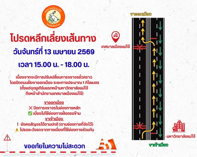 เทศบาลเมืองแม่โจ้ ขอแจ้งประชาชนว่า จะมีการปรับเปลี่ยนการจราจรชั่วคราว ในวันที่ 13 เมษายน 2569 เวลา 15.00 - 18.00 น.