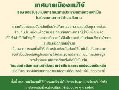 เทศบาลเมืองแม่โจ้ ขอประชาสัมพันธ์ ขอแจ้งปรับรูปแบบการให้บริการบางประเภท เช่น การบริการตัดหญ้า ล้างถนน และตัดแต่งกิ่งไม้ โดยจะพิจารณาดำเนินการตามความจำเป็นและความเร่งด่วน เนื่องจากสถานการณ์ด้านพลังงานแ