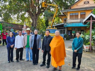 เทศบาลเมืองแม่โจ้ ประสาน อบจ.เชียงใหม่ สนับสนุนรถกระเช้าตัดกิ่งไม้สูง วัดป่าบง