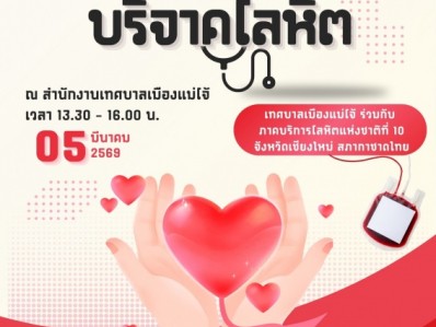 เทศบาลเมืองแม่โจ้ ขอประชาสัมพันธ์ เชิญชวนผู้สนใจร่วมบริจาคโลหิต ณ สำนักงานเทศบาลเมืองแม่โจ้ ในวันพฤหัสบดีที่ 5 มีนาคม พ.ศ. 2569 ตั้งแต่เวลา 13.30 - 16.00 น.