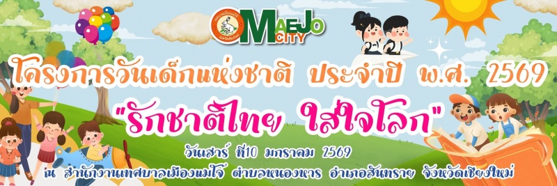 | 1 | รายชื่อเด็กที่ลงทะเบียนผ่านระบบออนไลน์ เข้าร่วมกิจกรรม วันเด็กแห่งชาติ เทศบาลเมืองแม่โจ้ ประจำปี พ.ศ. 2569 |