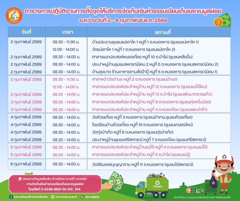 แจ้งประชาสัมพันธ์ตารางการปฏิบัติงานการตั้งจุดให้บริการจัดเก็บเงินค่าธรรมเนียมเก็บและขนมูลฝอย เทศบาลเมืองแม่โจ้ ระหว่างวันที่ 2 - 6 กุมภาพันธ์ พ.ศ. 2569