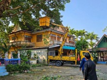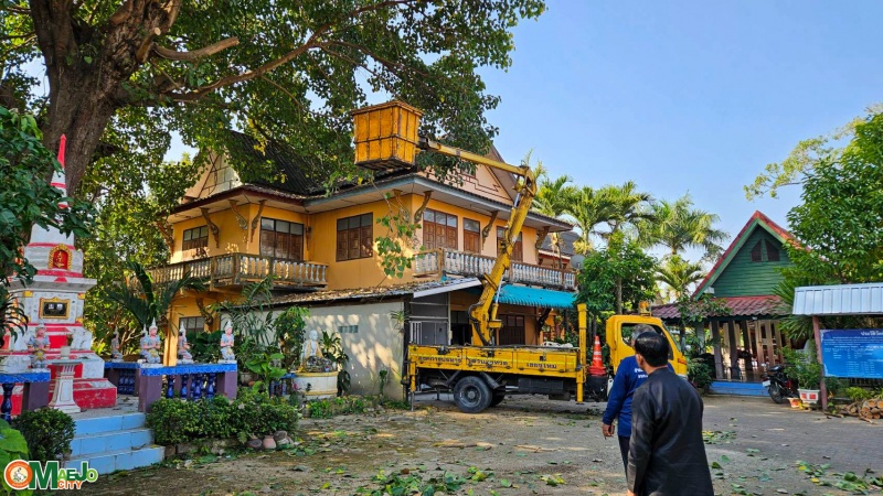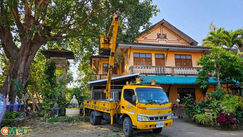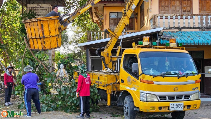 เทศบาลเมืองแม่โจ้ ประสาน อบจ.เชียงใหม่ สนับสนุนรถกระเช้าตัดกิ่งไม้สูง วัดป่าบง