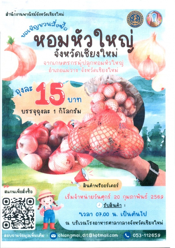 เทศบาลเมืองแม่โจ้ ขอความร่วมมือประชาสัมพันธ์ และสั่งซื้อผลผลิตหอมหัวใหญ่อำเภอแม่วาง จังหว้ดเชียงใหม่