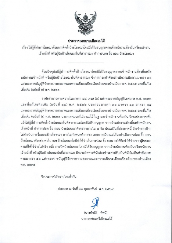 เทศบาลเมืองแม่โจ้ ขอประชาสัมพันธ์ประกาศเทศบาลเมืองแม่โจ้ เรื่อง ให้ผู้ที่ทำการโฆษณาด้วยการติดตั้งป้ายโฆษณาโดยมิได้รับอนุญาตจากเจ้าพนักงานท้องถิ่นหรือพนักงานเจ้าหน้าที่ หรือผู้ปิดป้ายโฆษณาในที่สาธารณะ