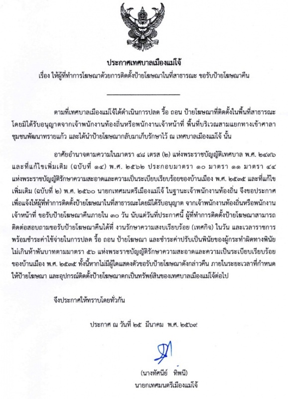 ตามที่เทศบาลเมืองแม่โจ้ได้ดำเนินการ ปลด รื้อถอน ป้ายโฆษณาที่ติดตั้งในพื้นที่สาธารณะ โดยไม่ได้รับอนุญาต