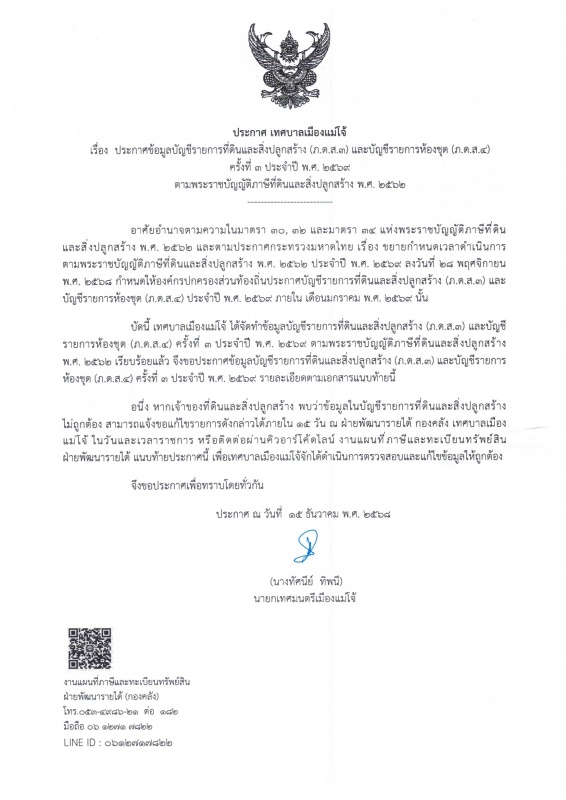 ประกาศเทศบาลเมืองแม่โจ้ เรื่องประกาศข้อมูลบัญชีรายการที่ดินและสิ่งปลูกสร้าง (ภ.ด.ส.3) และบัญชีรายการห้องชุด (ภ.ด.ส.4) ครั้งที่ 3 ประจำปี พ.ศ.2569