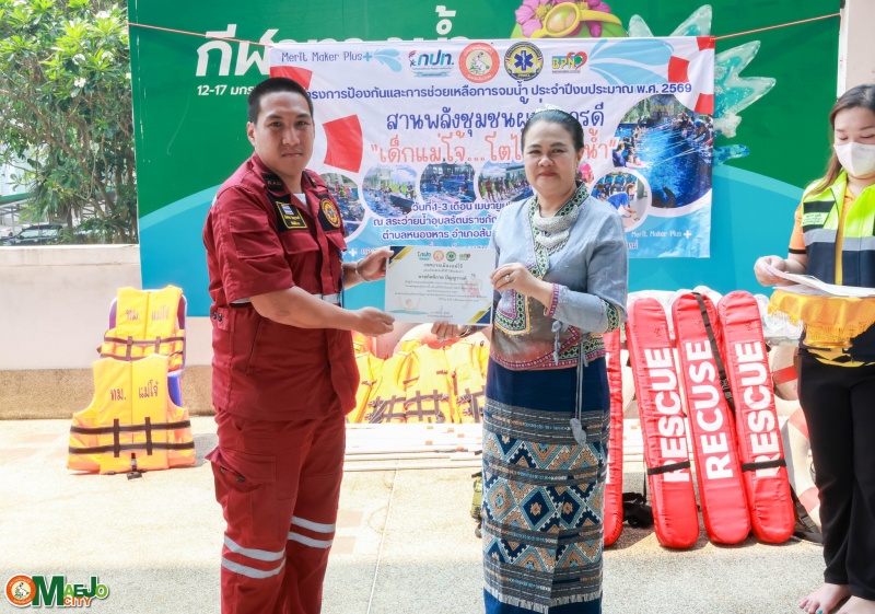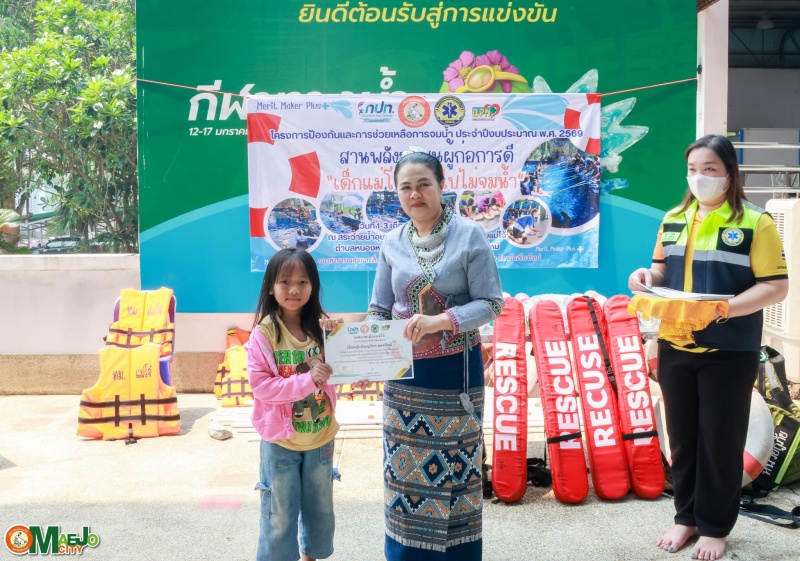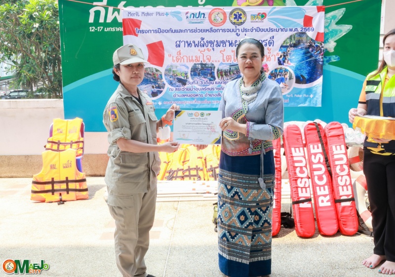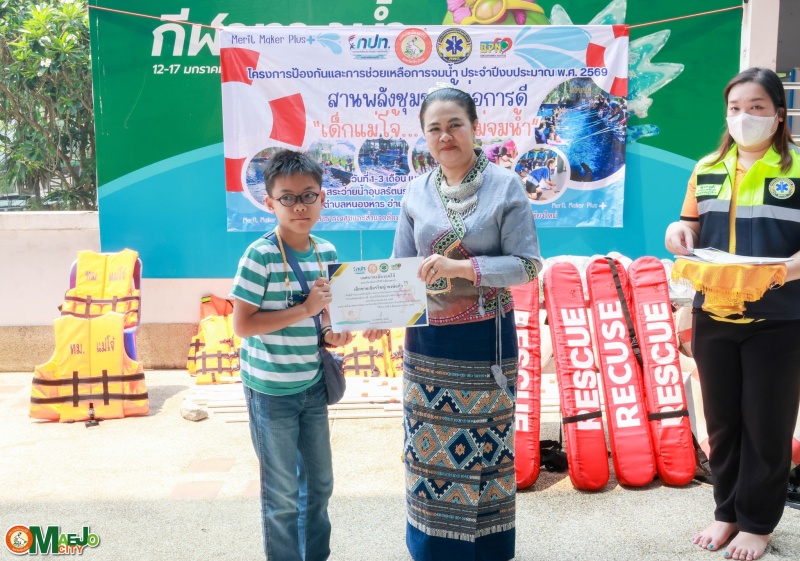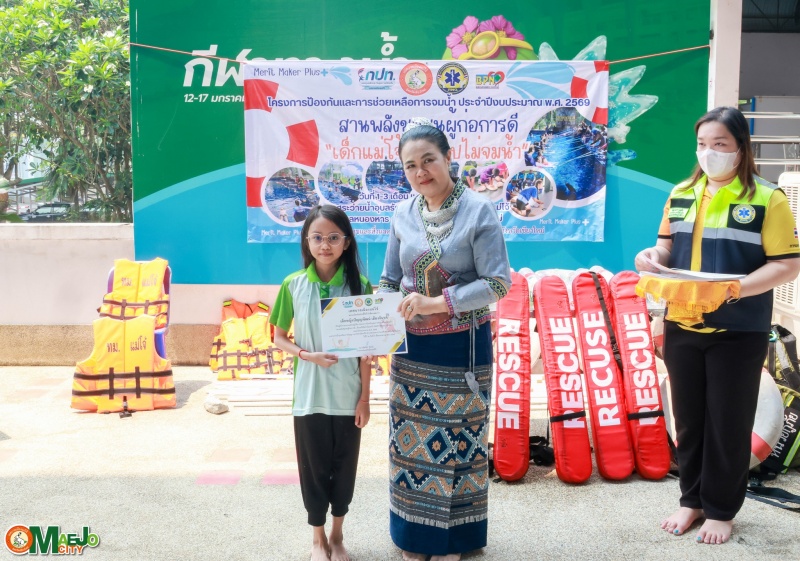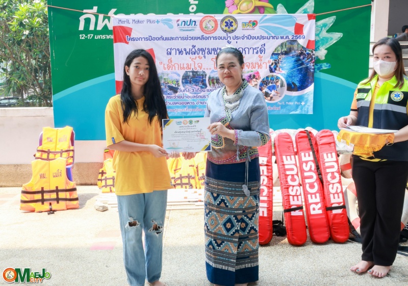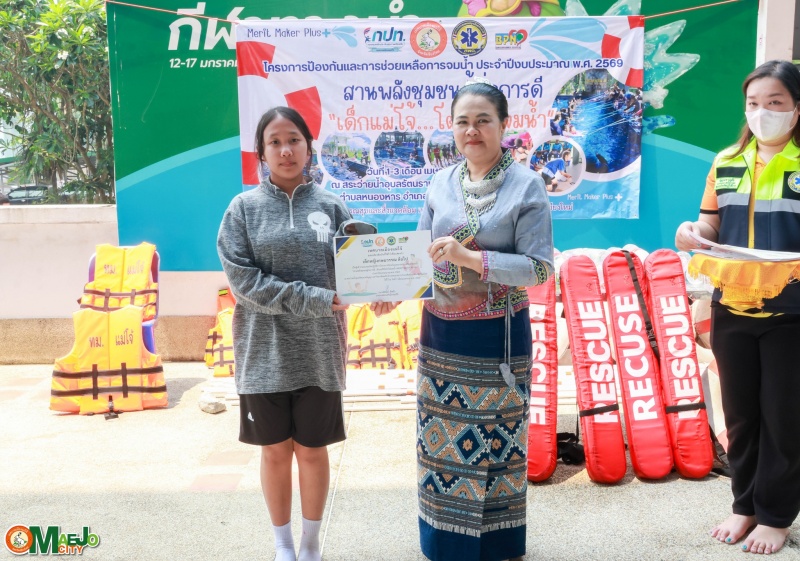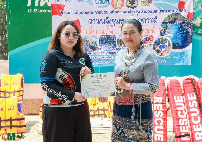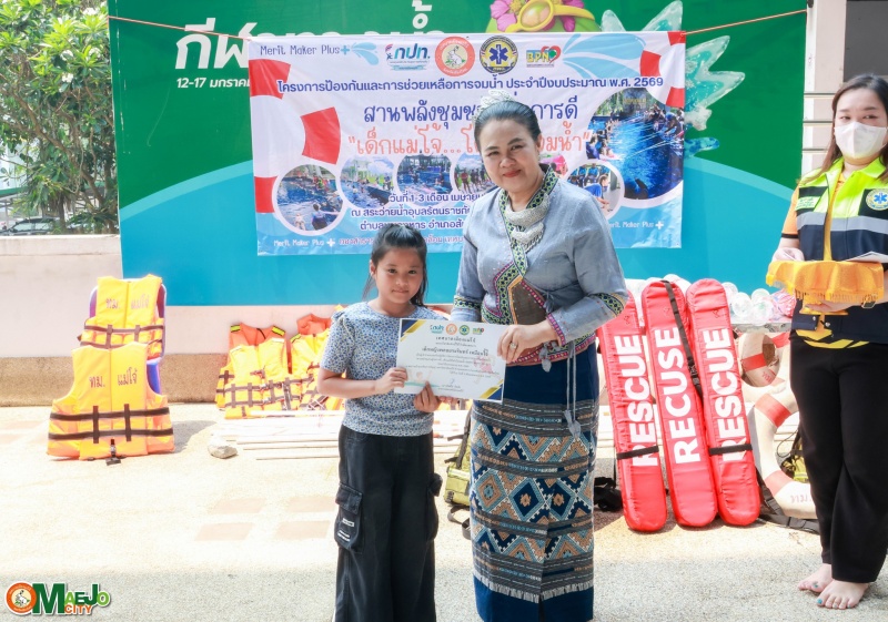 วันที่ 3 เมษายน 2569 นางทัศนีย์ ทิพนี นายกเทศมนตรีเมืองแม่โจ้ เป็นประธานใน พิธีปิดโครงการป้องกันและการช่วยเหลือการจมน้ำ "สานพลังชุมชนผู้ก่อการดี...เด็กแม่โจ้โตไปไม่จมน้ำ" ประจำปี 2569 พร้อมทั้ง มอบใบประกาศนียบัตรให้แก่ผู้เข้าร่วมอบรมที่ผ่านการฝึกอบรมตามหลักสูตร เพื่อเป็นกำลังใจและเชิดชูผู้ที่ได้รับความรู้และทักษะด้านความปลอดภัยทางน้ำ