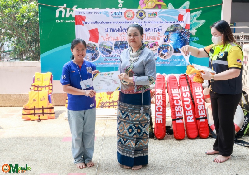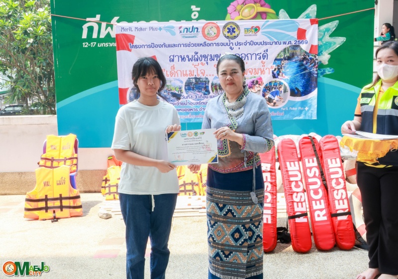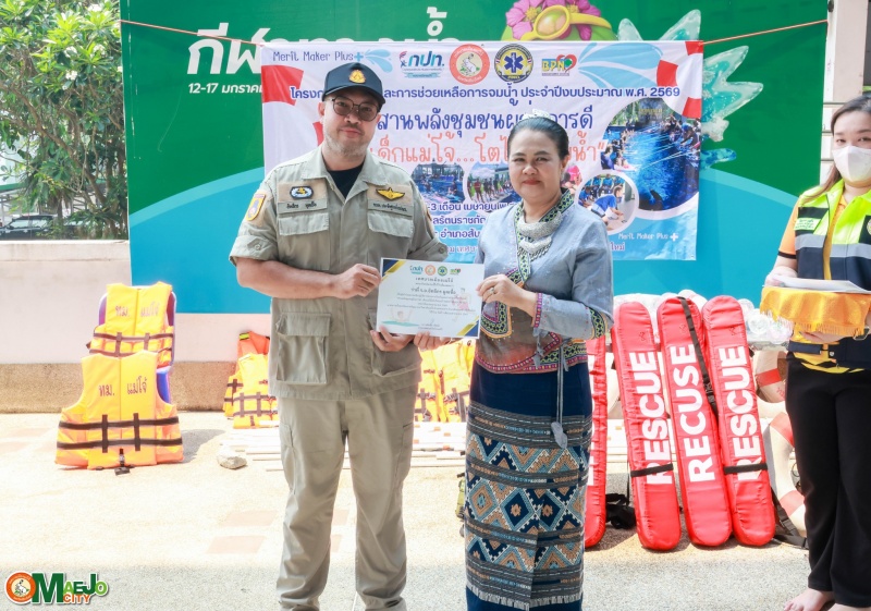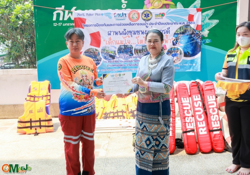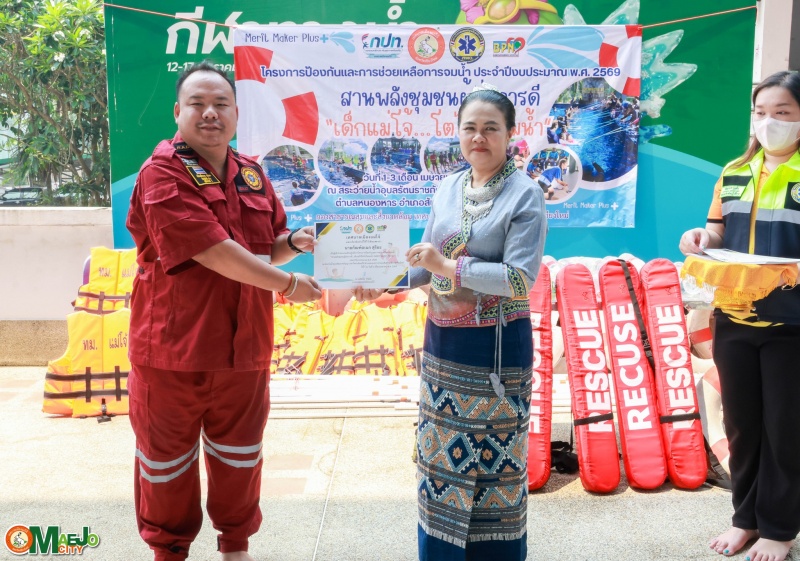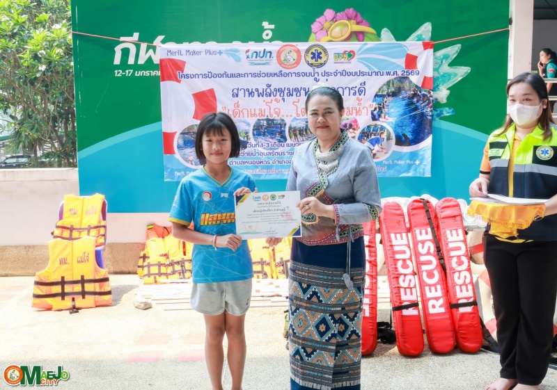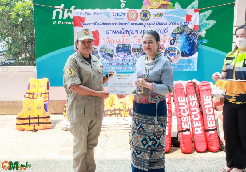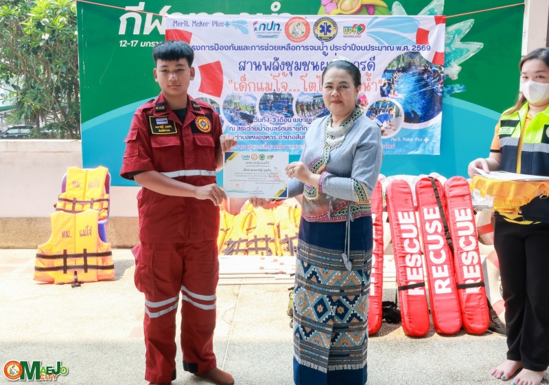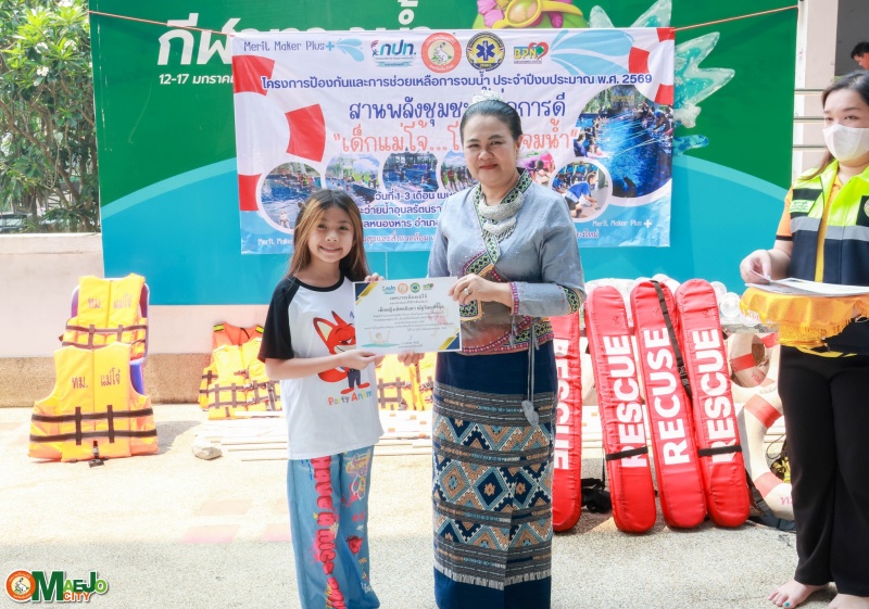 วันที่ 3 เมษายน 2569 นางทัศนีย์ ทิพนี นายกเทศมนตรีเมืองแม่โจ้ เป็นประธานใน พิธีปิดโครงการป้องกันและการช่วยเหลือการจมน้ำ "สานพลังชุมชนผู้ก่อการดี...เด็กแม่โจ้โตไปไม่จมน้ำ" ประจำปี 2569 พร้อมทั้ง มอบใบประกาศนียบัตรให้แก่ผู้เข้าร่วมอบรมที่ผ่านการฝึกอบรมตามหลักสูตร เพื่อเป็นกำลังใจและเชิดชูผู้ที่ได้รับความรู้และทักษะด้านความปลอดภัยทางน้ำ